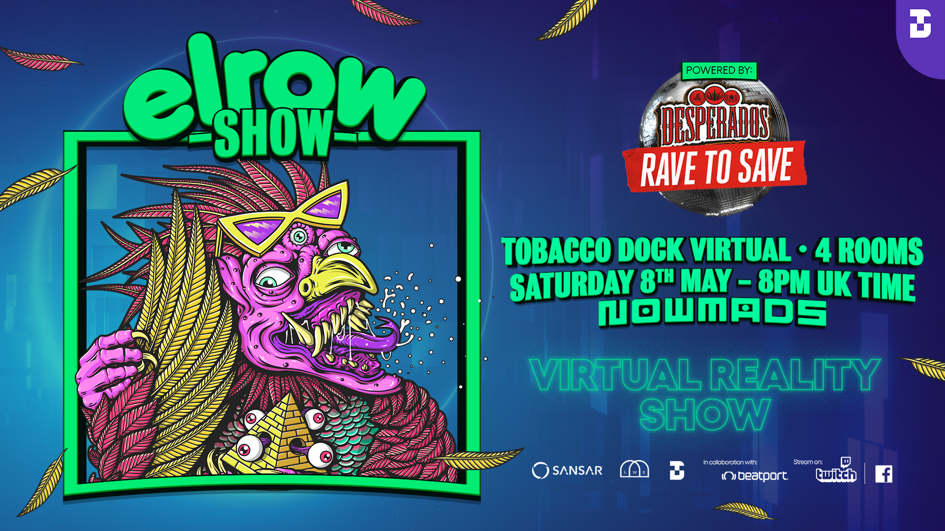 Explore and Stream tickets to elrow Virtual are free, thanks to our friends at Desperados. Explore tickets are limited, capped at just 6000 spaces. Head to www.tobaccodockvirtual.com to download yours. Via their Rave to Save campaign, Desperados have done much to support the electronic music industry across the last 12 months. Once again, the audience will be invited to participate in the Rave to Save initiative for the duration of the event, raising money for TDv whilst dancing to the sounds of elrow.