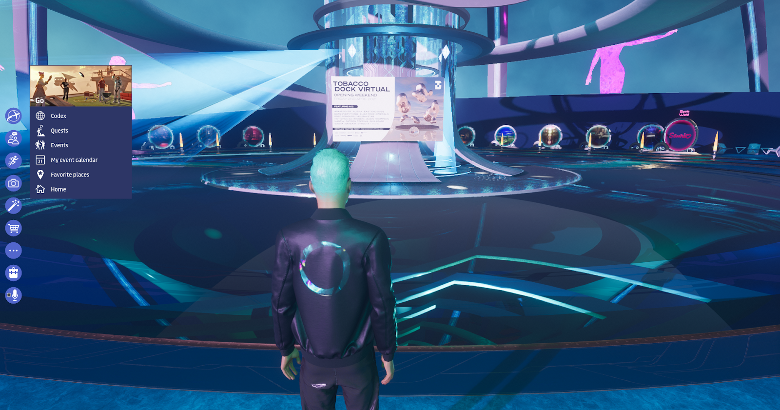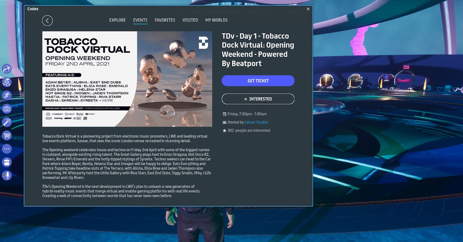 To enjoy the events via a mobile device, you can download the Sansar mobile app which allows a direct feed into the rooms at Tobacco Dock Virtual.